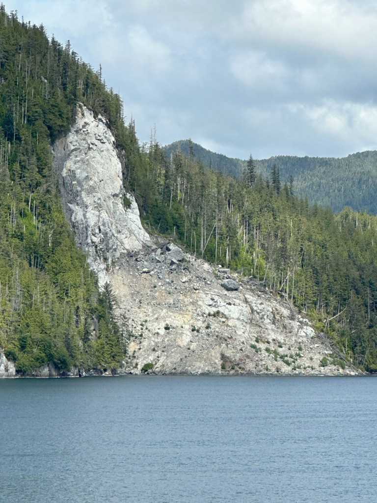The ocean appears to close behind us as we leave the Queen Charlotte Sound and navigate the twisty channels of Burke Channel. Such is the nature of fjords. The hills are steep and deeply incised with channels and rock falls. Old landslide scars are evident by the different vegetation. Lime green poplars starkly contrast with the darker green of the coniferous forest. Young scars are raw and light brown exposing rock and soil that has not yet been revegetated. This steep, rugged landscape represents young topography resulting from the rapid uplift of the Coast Mountains.