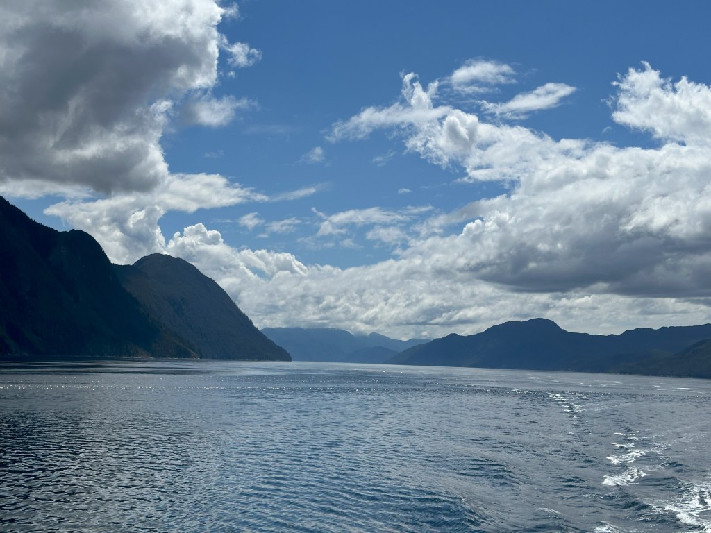 The sound of the foghorn rings out every two minutes as the Northern Seawolf navigates the Broughton Archipelago in the early morning dim. We are on our way from Port Hardy on the northern part of Vancouver Island to Bella Coola, a remote(ish) outpost on BC’s central coast. We’ve been promised whales on this trip by everyone in the know, but two hours into our journey we are still blanketed in thick fog. Although it is only mid-July, locals call this time of the year “Fogust”. I see a bit of blue sky though, and the occasional glimpse of land, so I’m hoping the fog will life a little later in the day. It’s a 10-hour journey through open ocean and fjords, which promises amazing scenery and diverse wildlife, so, fingers crossed!